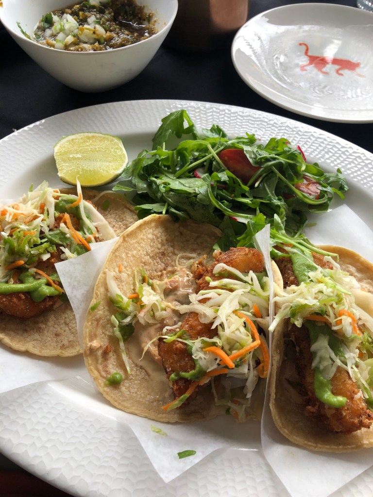 The tempura shrimp was less satisfying. The tempura was heavy. It was tasty, but too much. The hard shell was still nice as were the slaw and pico. Rebe would default to the grilled in the future and go back to the mushroom as a second.