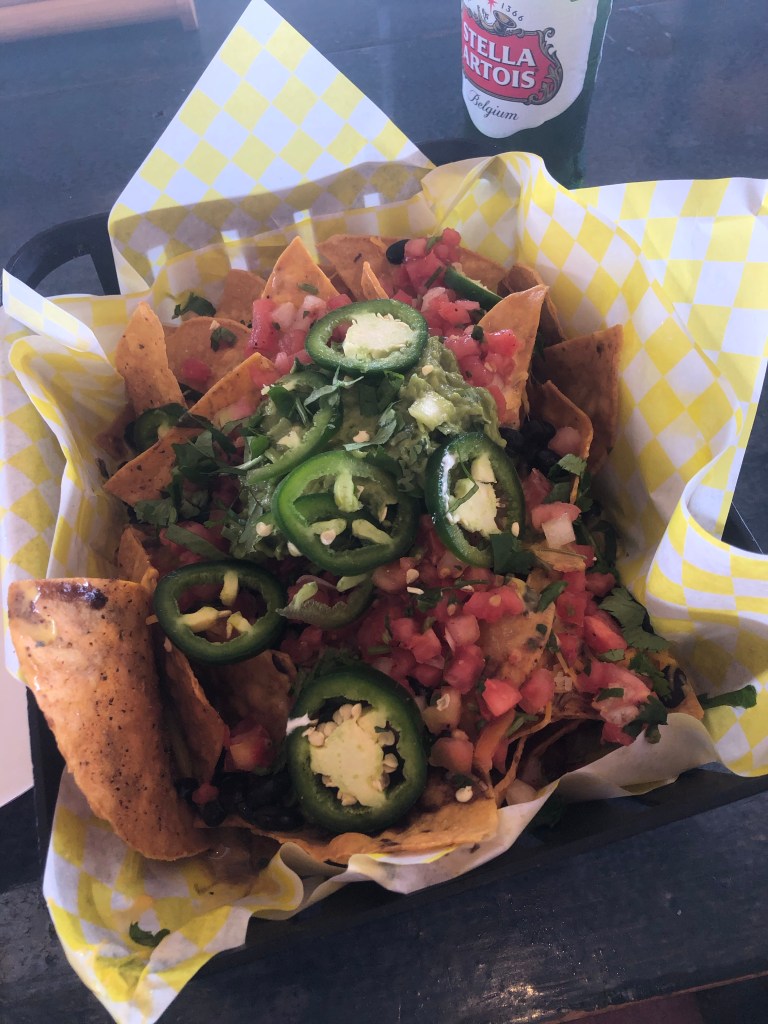 Veggie nachos to start. Loaded with seasoned chips, fresh jalapeños, pico, black beans, queso and cilantro. (We skipped the sour cream.) Good good good.