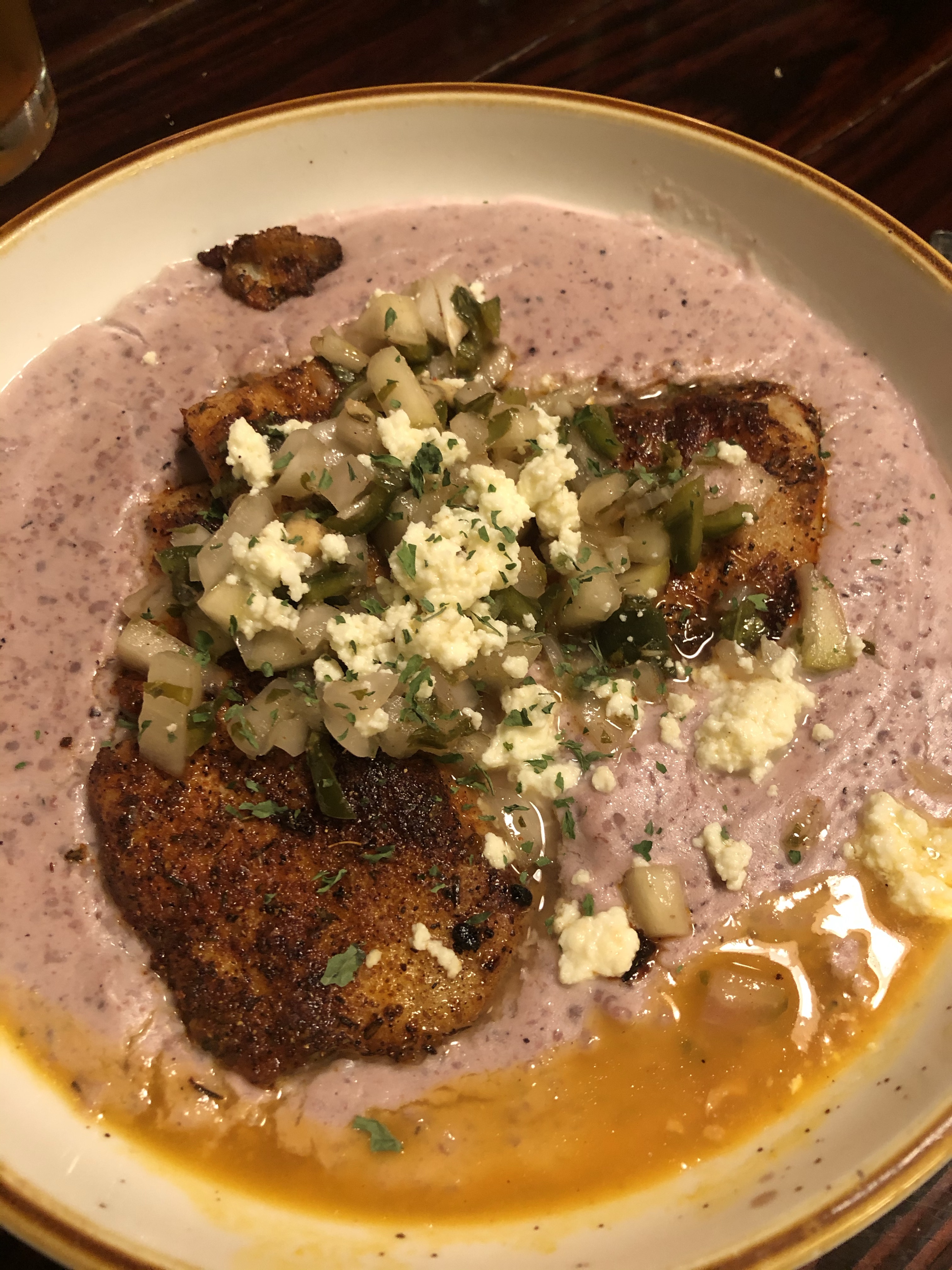 Modern preparations. Grits were creamy and the fish was seasoned well. I never figured out why they were purple. I didn’t have any of the cheese.