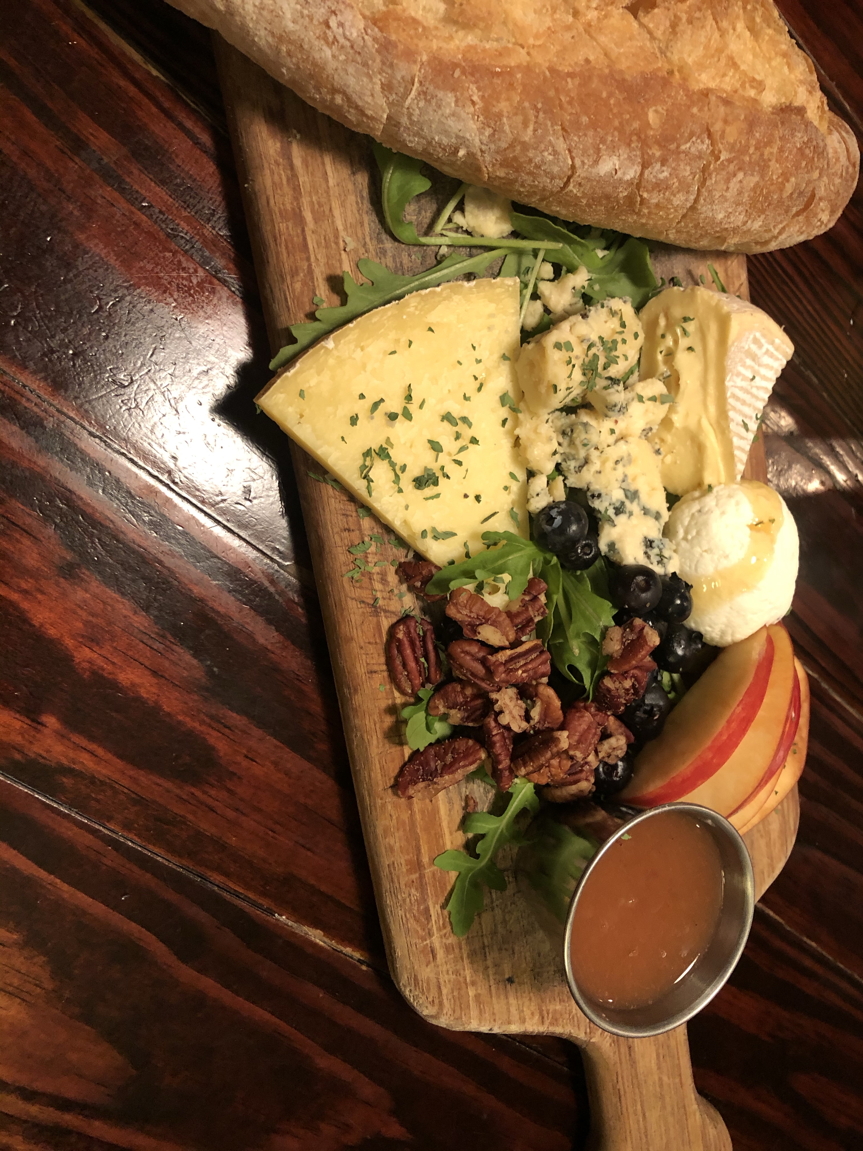 Vegetable chickpea based soup with a cajun flair toned down (with sugar?? can’t tell, not sweet…yet very good). Fresh fish and grits, blackened corvina today. Cheese plate for Rebe.