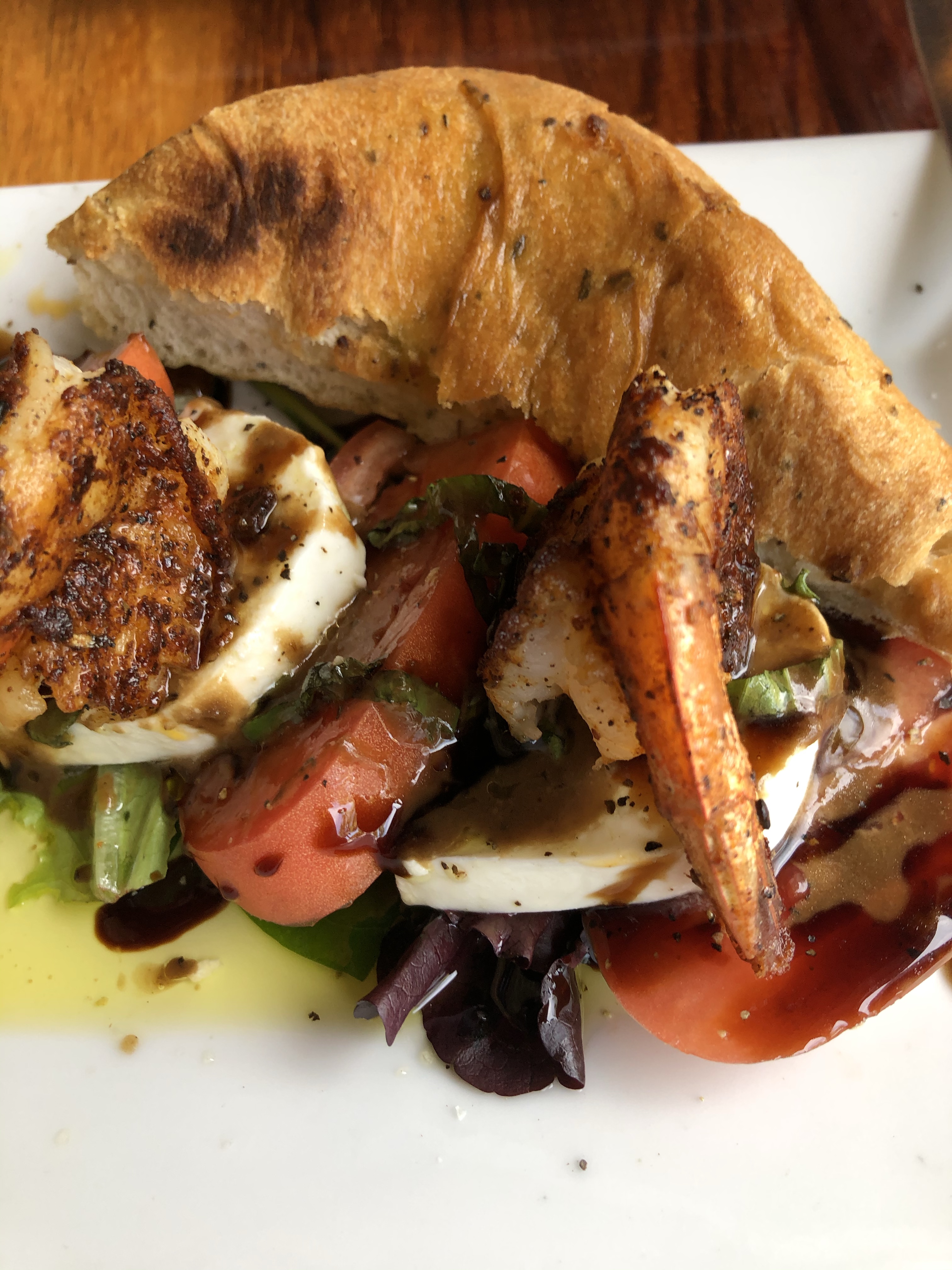 Blackened tiger shrimp caprese and spanish beef grilled burrito
