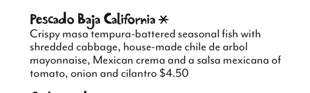 The fish tacos are cod. There is a spicy tarter that isn’t too over powering. The fish is not over cooked. Good crisp and texture.
